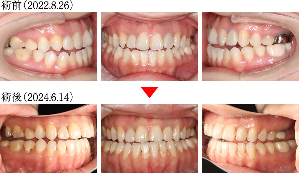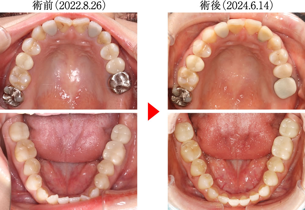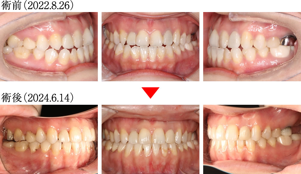 術前では、前歯が噛み合わず、乱れた咬合平面でしたが、術後は前歯が被蓋を獲得して整った咬合平面になりました。