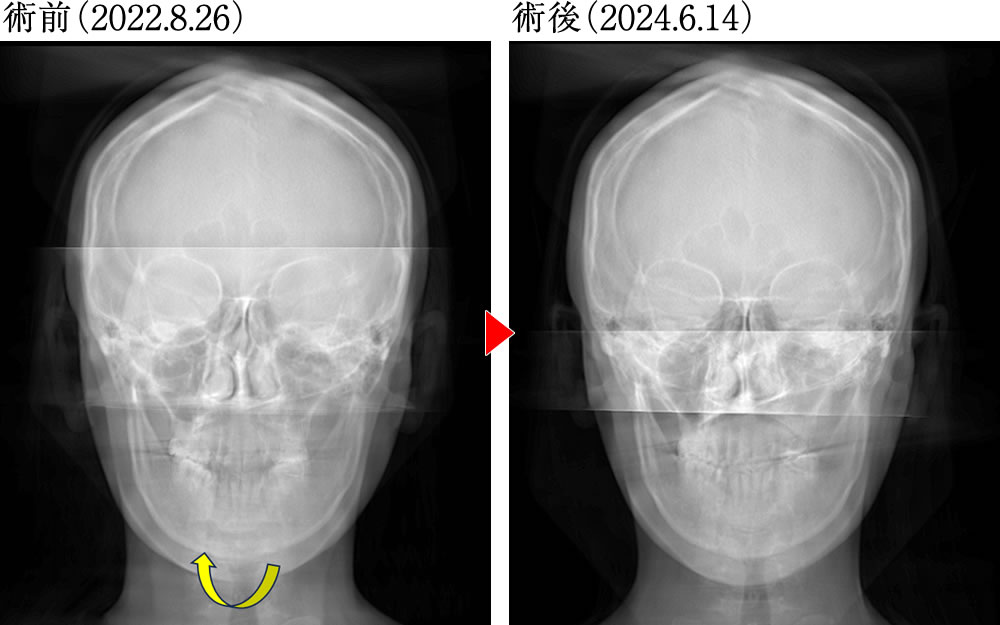 術前では、下顎骨体が右側に回転するように横ズレしていましたが、術後は正中方向に誘導されました。