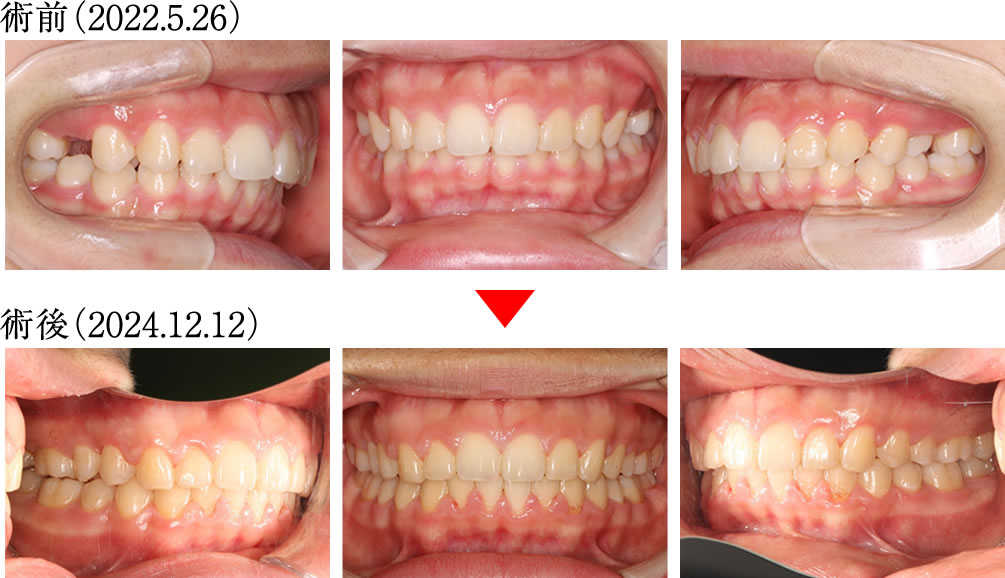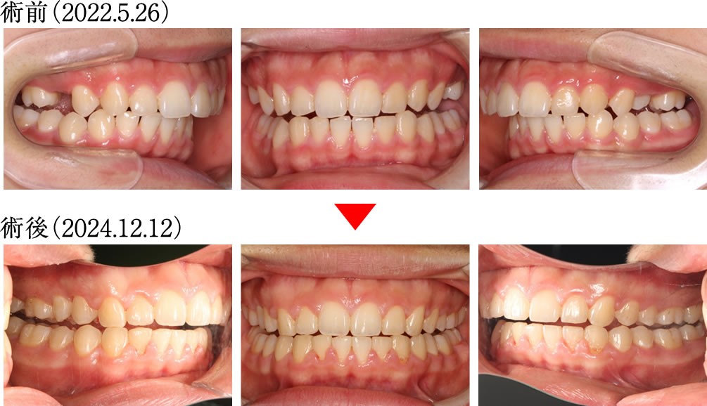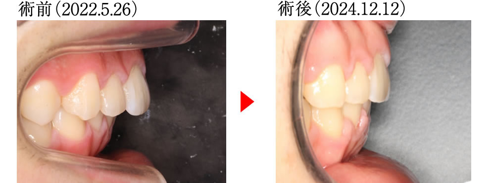 術前は前歯の噛み込みが深い過蓋咬合(かがいこうごう)の状態でしたが、術後は上下の前歯が適切な被蓋量で噛み合うようになり、理想的でバランスの取れた歯並びへと改善しました。