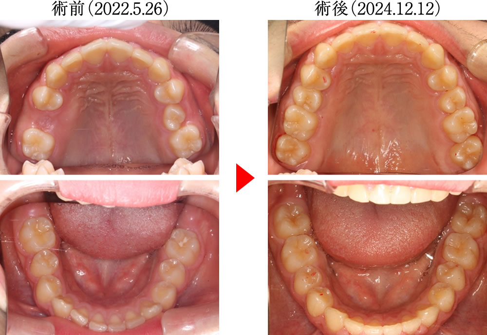 術前は歯列が側方に狭く、一部の歯には横方向への回転も見られましたが、術後は歯が理想的に整列し、きれいで広がりのあるアーチ状の歯並びへと改善しました。