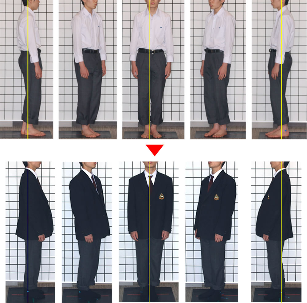 術前は膝の上に上体が乗るような姿勢で、強い猫背が見られましたが、術後はやや反り腰の傾向はあるものの、全体として理想的な姿勢に近づきました。