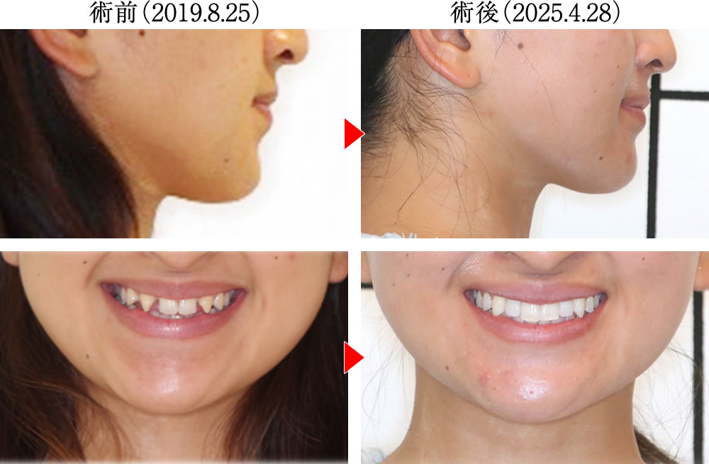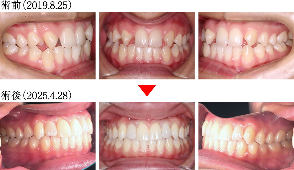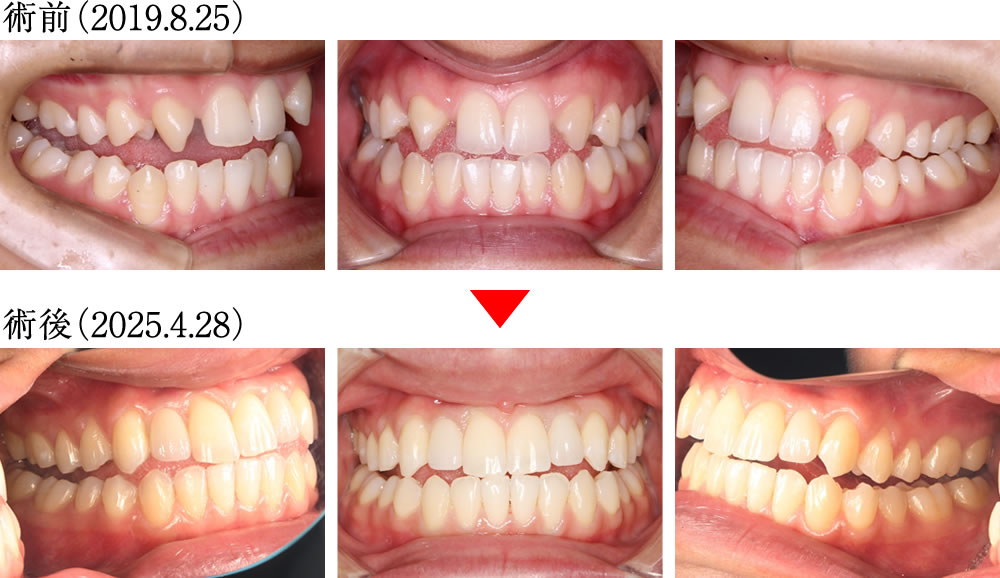 術前では、前歯に欠損と隙間があり、奥歯も正しくかみあわない歯並びでしたが、術後は上下の歯が理想的な傾斜と被蓋関係で咬み合った歯並びになりました。