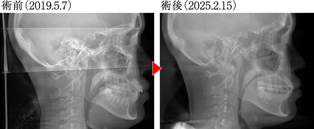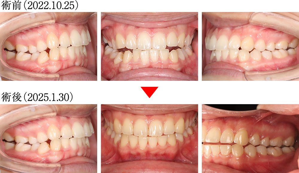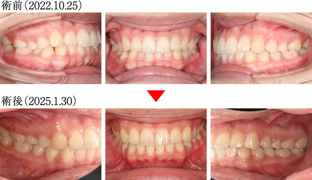 術前は上下顎の正中がずれており、右側に咬合不良が見られる歯並びでした。しかし術後は上下の正中がしっかりと揃い、理想的な被蓋関係で噛める、きれいで安定した歯並びへと改善しました。