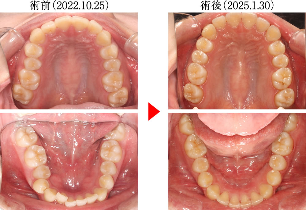 術前は歯が重なり合うように乱れた歯並びでしたが、術後は歯が理想的に整列し、きれいで大きなアーチを形成する歯並びへと改善しました。