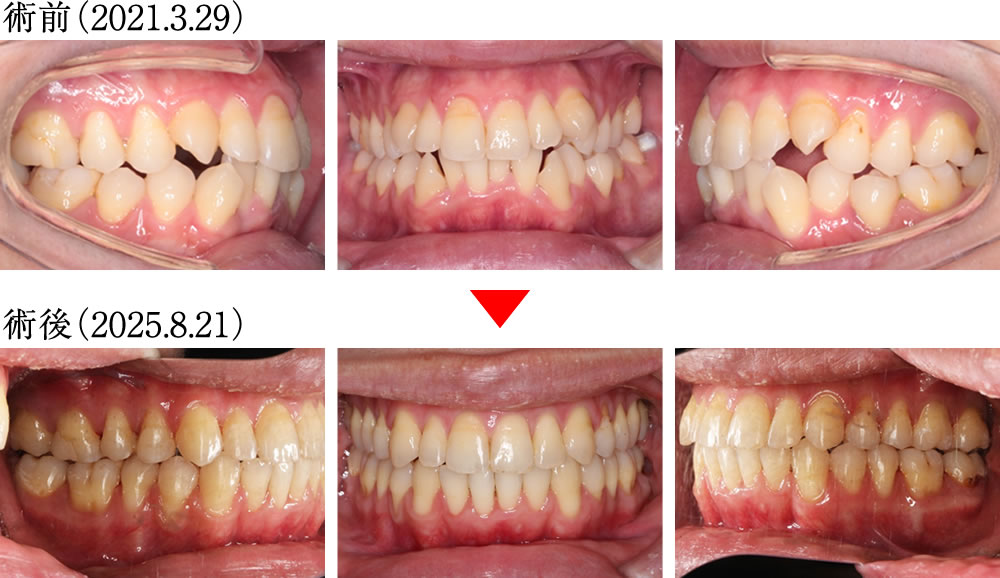 術前は、前歯と奥歯の歯並びが乱れており、咬み合わせにも問題がありましたが、術後は上下の歯が理想的な傾斜と被蓋関係で咬み合い、美しい歯並びとなりました。