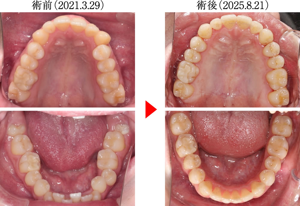 術前は歯列が狭く、アーチが不均衡に乱れていましたが、術後は歯が理想的に整い、美しく大きなアーチとなりました。