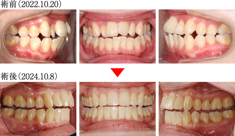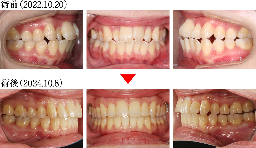 術前は強い前方傾斜とクロスバイトを伴い、正しく咬み合っていない前歯でしたが、術後はきれいに整った理想的な歯並びになりました。