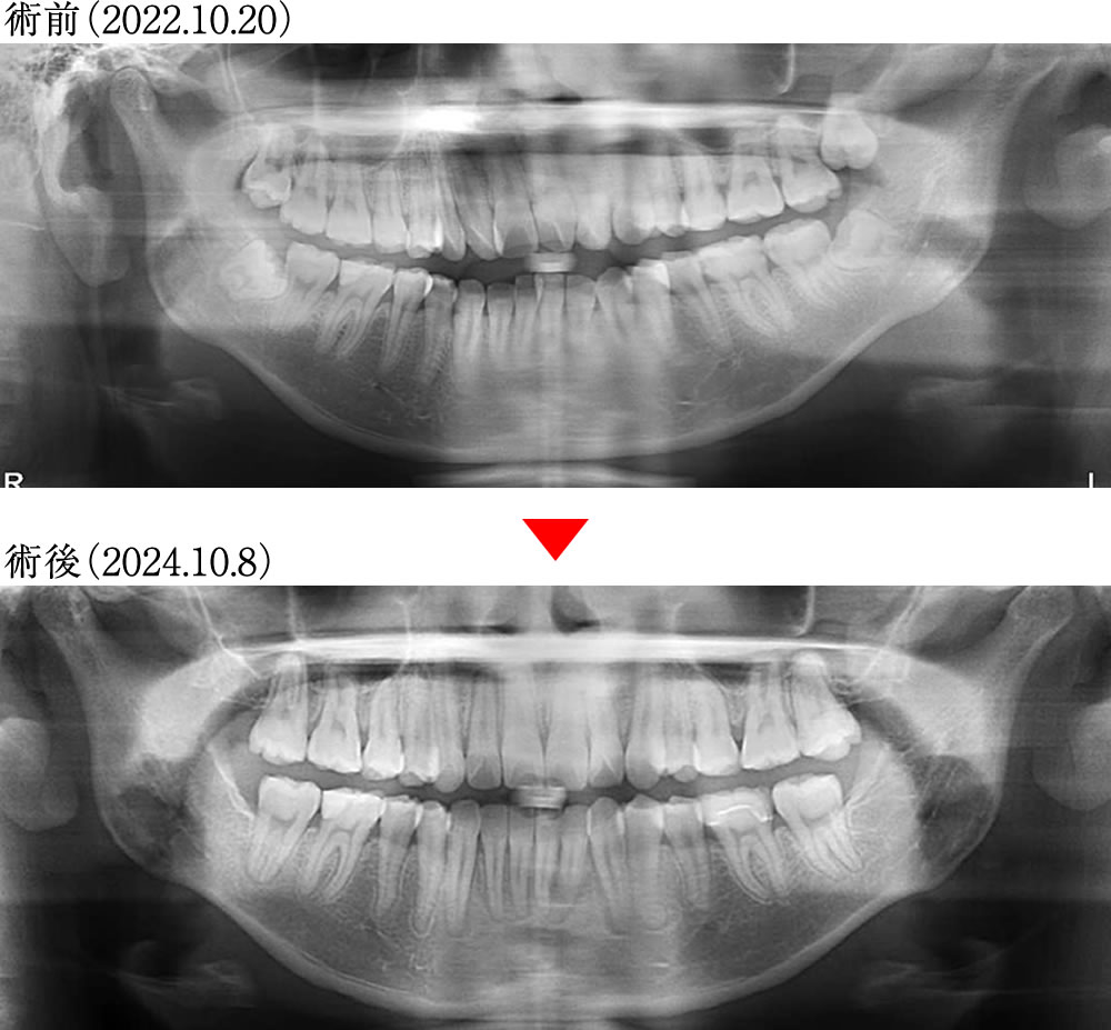 術前は咬合平面に左右差があり、多くの歯が不規則に傾いている状態でしたが、術後は咬合平面がきれいに整い、歯も整直されました。